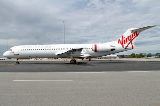 Virgin Australia's first Fokker 100 VH-FSQ msn 11450 'Bills Bay' hit to the skies both yesterday and Friday operating circuits around Perth Airport, and operating one out to Rottnest Island on Friday. The F-100 is photographed here on the ramp at Perth Airport after completion of her flights this weekend.